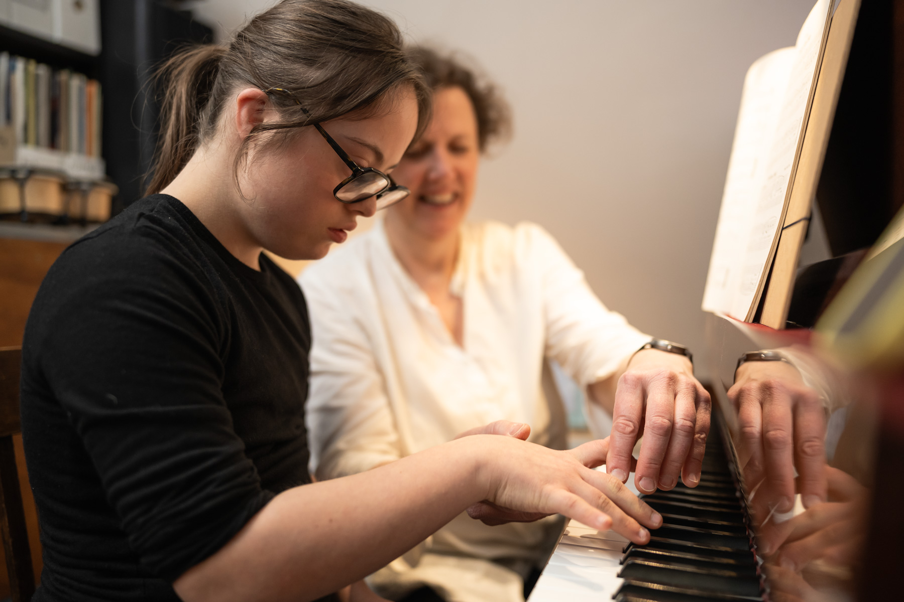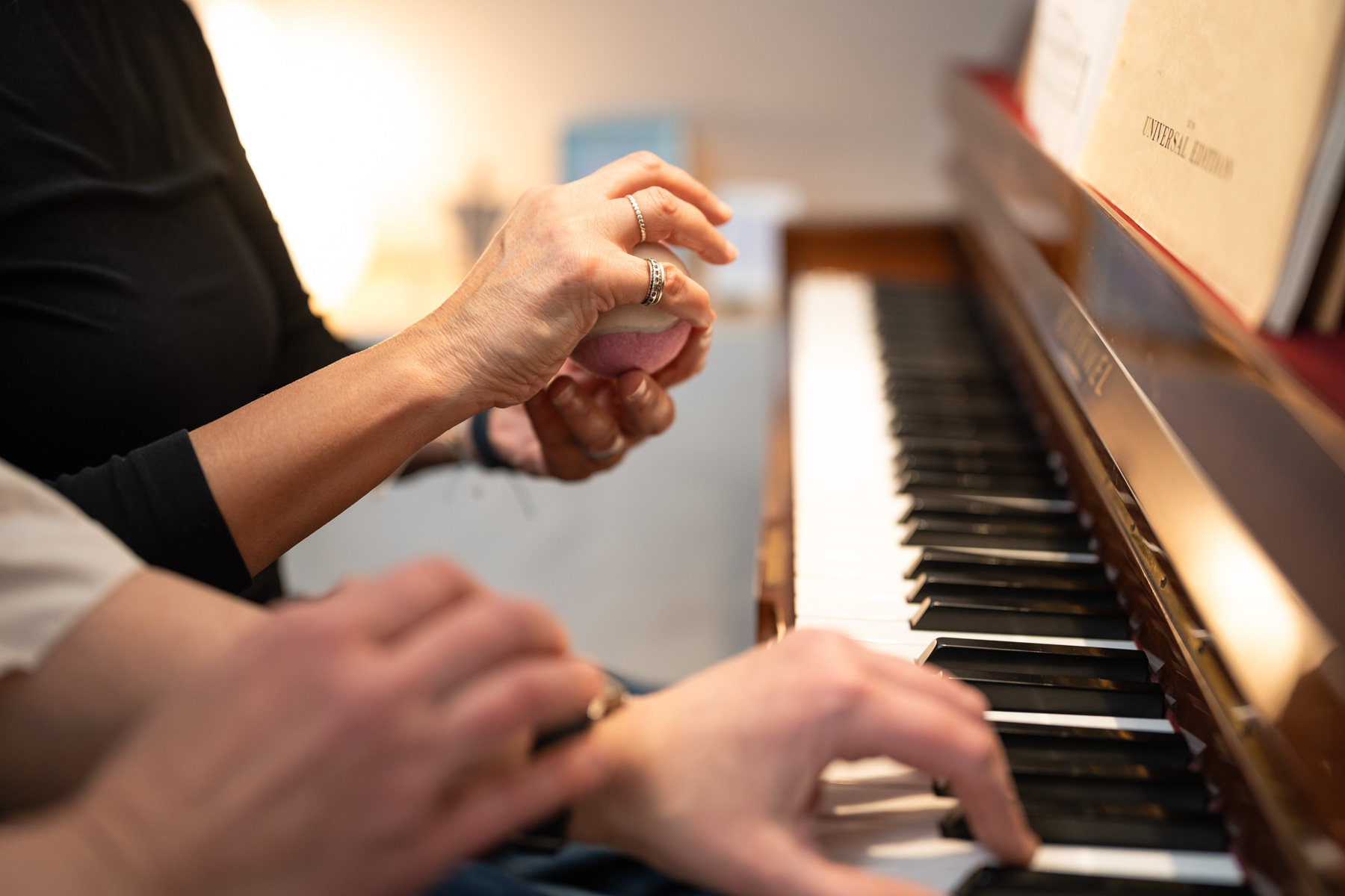 Da das Notenlesen viel Aufmerksamkeit erfordert, beginne ich bei Anfänger*innen (egal, ob es sich um Kinder, Jugendliche oder Erwachsene handelt) den Unterricht ohne Noten. Im Vordergrund stehen Hören, Körperkoordination und erste Schritte in die Klangwelt des Klaviers. Später, wenn die Aufmerksamkeit dafür geweckt ist, wird dann die Musiktheorie anhand der anschaulichen Klaviertastatur einbezogen.